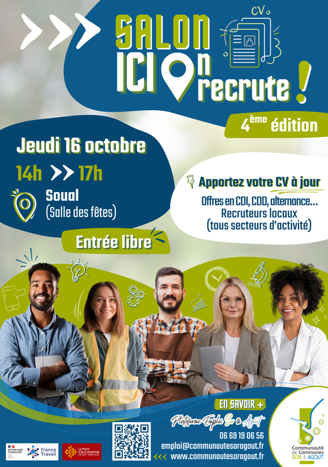 Mardi, 7 Octobre, 2025 - 16:15La Communauté de Communes Sor & Agout (CCSA) organise le Salon de l’emploi « ICI, On Recrute ! » le jeudi 16 octobre à la Salle des fêtes de Soual.