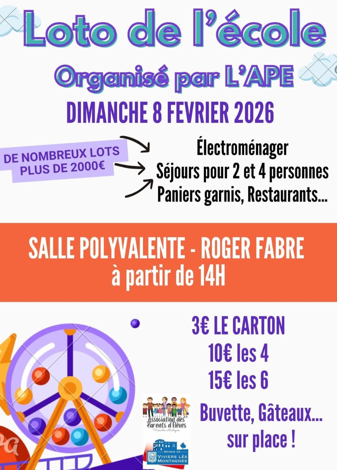 LOTO de l'Ecole organisé par L'APE : Dimanche 08 Février 2026 à 14H